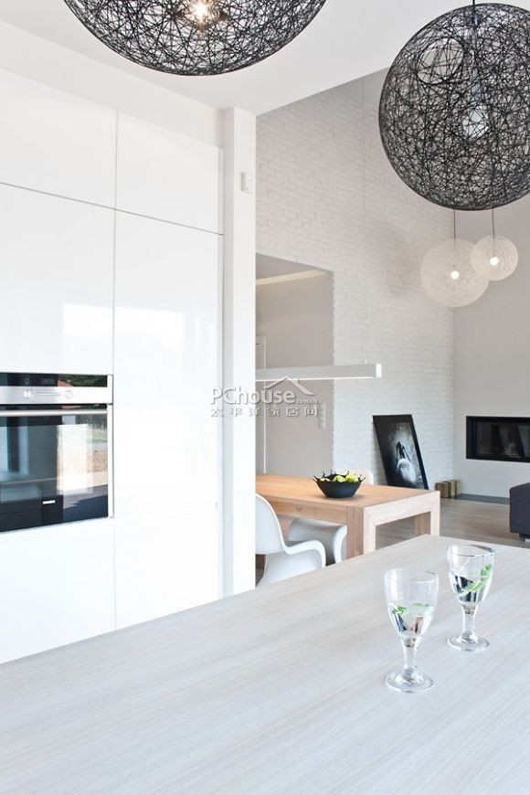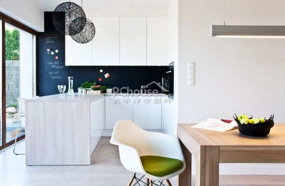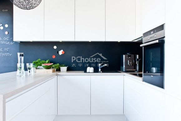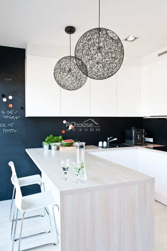独立设计则保持了各个房间风格的一致性。厨房与客厅空间仅有短墙相隔,白色和清漆淡色系整体厨具,同样的深蓝黑墙面,黑色镂空圆笼灯具垂吊而下。