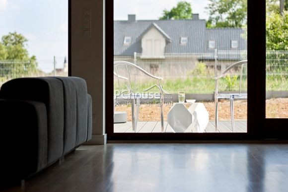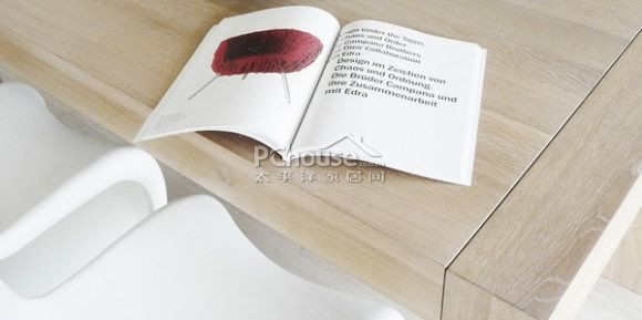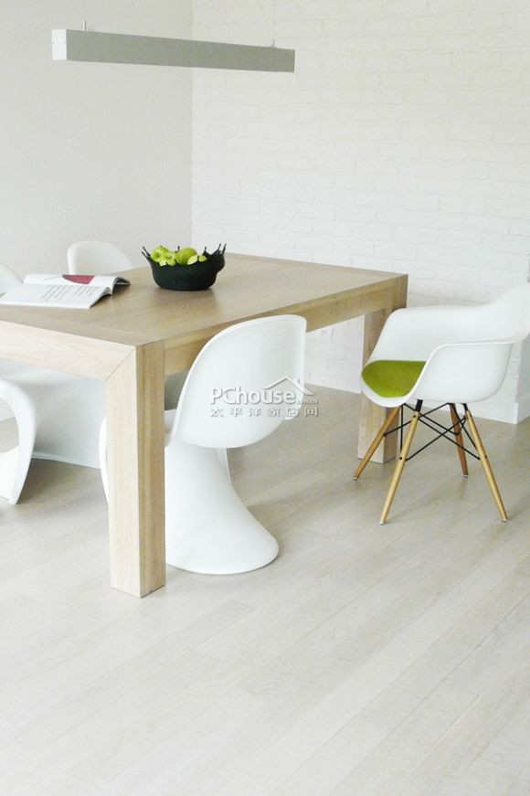 餐厅与客厅是一体式空间,外侧墙体为开放式玻璃滑拉门,清漆原木色餐桌配上白色曲线餐椅。