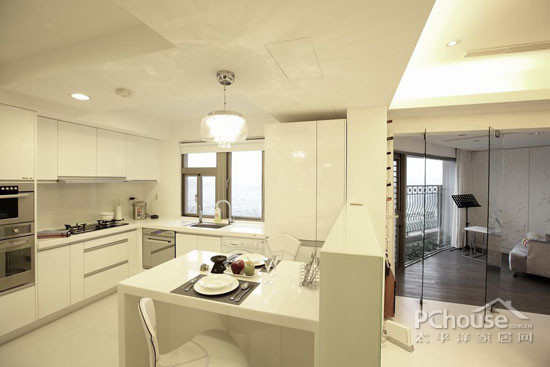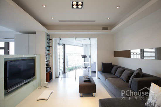 让实用设计成为装饰体是此案特点之一,书房区域不对称的白色书柜,赋予开放展示的活泼线条,让机能柜成为公共场域的视觉焦点;卫浴空间隐藏于茶镜之后,白色空间里的茶色区块,让整体居家不会太过单调,亮面素材对应到电视墙的白色烤漆玻璃,往右侧延伸出现代感的机柜、红酒柜,机能更趋完善。