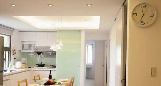 温馨的餐厨区域,接近建筑受光面,使得厨房能跳脱阴暗的印象,因此更要让光影不受阻隔,原来设定的开放式规划,却也同时遇上风水条件,一进门视线对到炉灶的禁忌,灵光一闪的活动烤漆玻璃门,遮挡面向炉灶的视线,兼顾室内空间的通透与延伸。