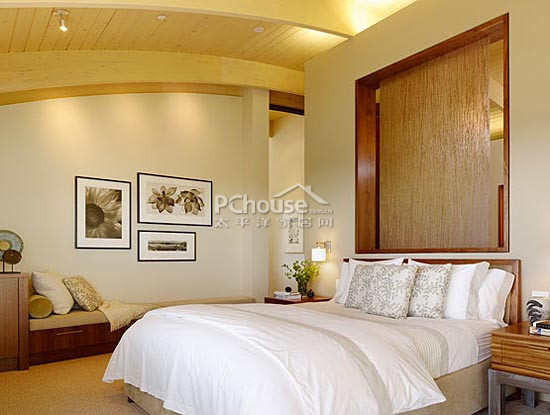 卧室采用了灌木的木质材料,并将其染成近似核桃的颜色,这种设计符合大部分现代人对内部装修的要求而且具有异国风情。