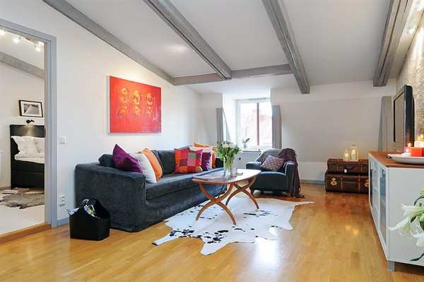 色彩斑斓的客厅被白色的墙壁围绕,使人在寒冷的冬日感到无尽的温暖。客厅的天花板有一个可伸缩的屋顶窗,晚上可以打开窗户欣赏夜空的美景。大窗户的设计使自然光透入客厅,使室内显得通透明亮。