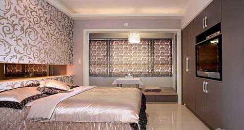 主卧室细腻简约,以白色空间为背景,运用咖啡色调与毫灰色调揉合出空间韵味,主墙的浅古铜色花草图腾壁纸,与窗扇罗马帘的调合感,让睡眠空间展现优雅而细致的氛围,在窗台边延伸一区架高木作休憩区,是夫妻间聊天谈心最舒放的场所,辅以间接照明柔和灯光,搭配温润木作质感,强调的是扎实的居家舒适触感及内心的满足。