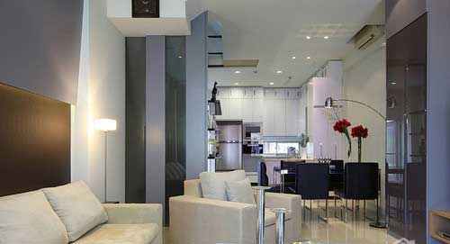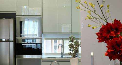 屋主是成功的餐饮企业家,对于饮食与生活品味相当的重视,因为设计师在厨房区选用钢构材嵌黑玻展示架与时尚的黑烤玻餐桌作互相呼应,如珍珠般的展示架条灯为柜体收边;料理厨房区以简净的白色做专业的分类收纳,餐桌边放置一盏弯曲不锈钢管灯具,俐落的弧线刻划出屋主对餐饮的细腻品味。户外窗景绿意为伴,中岛式小料理台建构出餐厅、厨房通透流畅的动线与健康无压的环境,视觉感官清朗又舒畅。