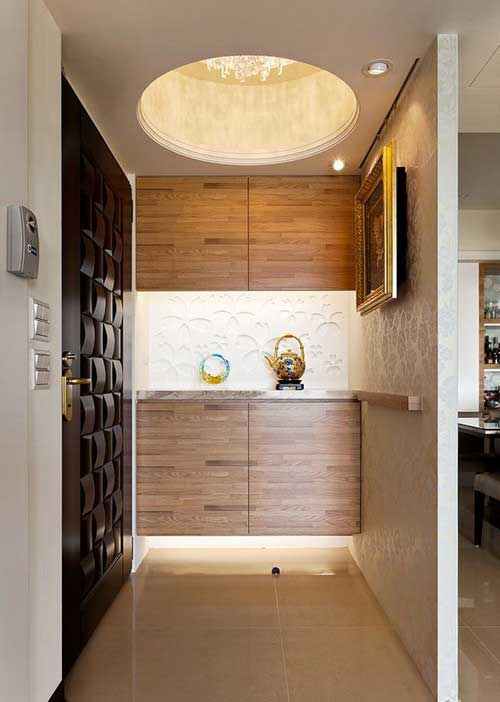 素雅花朵图腾壁纸贴饰于玄关入口处的第一道短墙面上,舞动得金龙以黑底金框的饰框跃然其上,下方另有一道木层板型塑拱金的旺财风水意象,华美的水晶吊灯,从向上挑高的圆形天花上方晕射出柔美光芒,第一道墙面蕴含招财的风水设计,也织就出温馨的玄关表情。