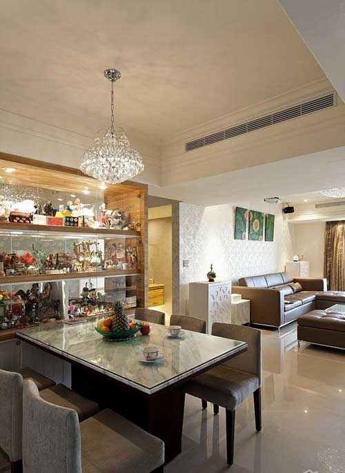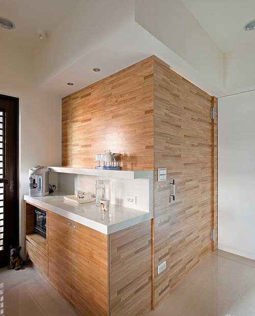 顺着第一道墙面行走进到后方的餐厅空间,L形设计的展示柜摆满了喜爱旅游的屋主,从世界各地带回来的旅游记忆,而第二道墙面就是以展示柜搭配设计,分隔厨房与餐厅的隔间墙,进入厨房的门片延伸玄关墙面壁纸,设计师去化门片的存在感,型塑完整的空间线条。