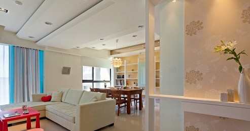地平线的延伸外,天花板中的天际线,因有大樑走过因素,以沙发为中心向客、餐厅两侧,做出层次性的升高设计,而为减少压迫感,设计师张巧慧更特别选以低背设计沙发,开阔空间视野。
