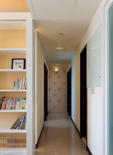 一旁以玄关木作延伸加大的厨房空间,在雾面玻璃拉门引导下,引领进入屋主的私人空间,因原格局较为狭长,大书柜旁巧妙加入间接采光,和端景墙壁灯一同点亮走廊。