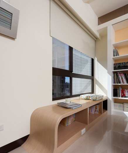 娱乐功能中除满足小朋友外,大人所使用的视听机柜,则统一收纳于半开放式高柜中,门板上暗把手设计,展现着大人专属的成熟品味。静态中,餐厅的大书柜便是一家人的梦想起飞地,移动式的烤漆玻璃,涂鸦着小朋友的成长纪录,而陪伴性的阅读空间,圆弧修饰矮柜呈现出窗边卧榻的悠閒。