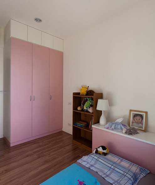 因考虑到小女孩睡眠安全性,女孩房在屋主和设计师张巧慧沟通下,捨弃床架改以超耐磨地板及床垫,在粉嫩的色彩中打造小女孩的专属浪漫。