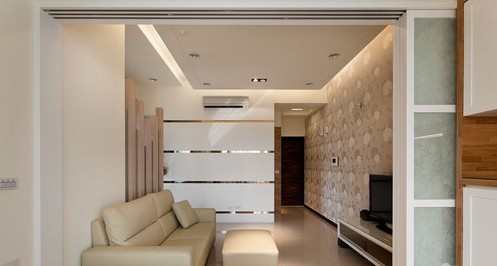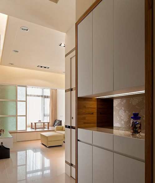 从捷运站出发,不到一分钟的时间,就抵达了设计师庄巧慧的作品,超强的交通机能已让人大为钦羡,推开大门,造型壁纸从玄关一路延伸至客厅,意外开阔出三米四的挑高视野。而仅有两臂伸展宽度的玄关处,为解决顶天鞋柜桶深不足问题,设计师张巧慧在柜体内侧改以倾斜层板设计,加深空间量,并方便屋主拿取。