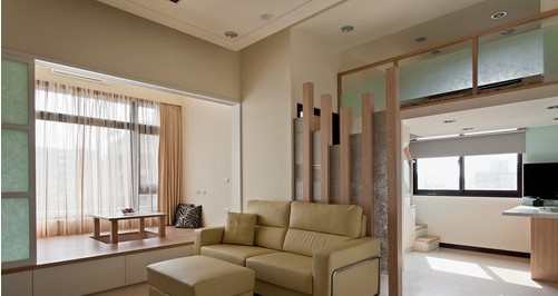 在灰镜的引导下,进入客厅空间,不同于一般的石墙或壁纸隔间设计,夹纱玻璃穿插上枝条,未及顶的层次设计,将自然采光带出澹澹穿透性,让空间显得不过于狭小。另外,在小空间中一物多用也考验着设计师的智慧,常见的 L型沙发,在这改以一字造型,搭配上单张,亲友来访时铺上布,成了最实用的小茶几,若是一人独享,则有着贵妃椅的优闲,当然,两人时就成了绝妙的脚椅。