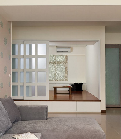 专属小朋友的小和室拥有前阳台的充足日照,穿越温馨简洁的客厅空间,设计师拆除一道墙面,打造拥有后阳台光照及收纳机能的多功能大和室空间。设计师奢侈的规画四坪大的和室空间,但细看其中的使用规划,会发现它其实超乎五坪的使用机能。架高四十公分的木作地面除了前方有四格大型抽屉,上方还有八格上掀式收纳空间,窗户边架高的白色收纳柜更是有深达80公分的收纳容量,更遑论一旁的衣柜及全面式展示柜能有多少的收纳容量了。