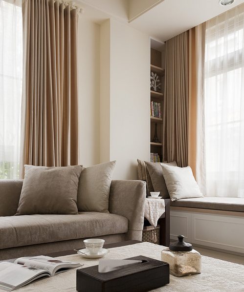 【太平洋家居网 设计频道】白、米、咖啡,温暖的色彩染出渐层,描绘一幅和谐风景,尤其大面开窗所导入的阳光,明亮空间裡的每个角落。喜爱古典风的女主人,希望空间保有古典韵味,但不能太华丽,因此设计师将风格定位为美式轻古典,让美式的单纯元素,平衡古典的繁重。客厅白色基调,融入美式设计概念,两组暖色沙发搭配窗边的长卧榻,保留视觉的明亮与宽敞,亲友来玩时,是热闹的聚会场地,仅有家人时,转为温馨休闲的空间,而线板也仅仅点缀电视墙的小部份,改以壁纸与家饰的色彩搭配,带出轻古典的味道。