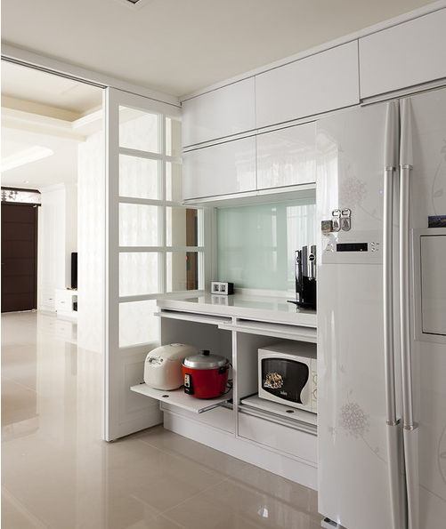 回应女主人的需求,拆除原来半开放设计吧台区,改以横拉门明确界定厨房与公共空间,亦阻绝下厨时的油烟,在平数宽敞的前提之下,设计经典的四面格状玻璃门,由中央开启生活动线,原汁原味的美式做法,让餐厅融合二种风格的优点,倚着落地窗望向户外,用餐时光更加惬意。