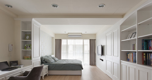 二楼主卧以水蓝壁纸妆点,考量到未来清洁的必要性,以平钉天花板取代层次设计,并发挥巧思,让电视墙机柜偷了更衣室一个抽屉大小的空间,维持视觉完整。四楼的长辈房以弧形天花修饰多樑柱的问题,更特别的是,设计师运用一道屏风,解决了床头与床尾不对等的矛盾感,躺卧视线因凋花屏风的遮蔽,适时修正宽度比例,睡眠品质更安稳舒适。
