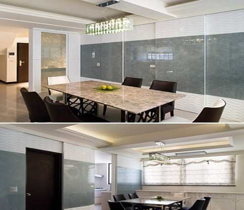 呼应餐厅的设计延伸到客厅,为了营造出不同凡响的氛围与空间的质感,电视主墙上方则采用茶镜的设计,达到延伸视觉的效果。转角处的畸零空间设双层收纳柜,达到空间再利用的目的。利用线板的修饰,让天花板向上延伸出层次感,搭配上屋主所喜爱的水晶灯,不但接有新古典的华丽,又非常的素雅,让空间有上升的效果。配上简约美式的色系及空间配置,营造美感又可以满足现实生活中好保养好维持的美式轻古典。设计师巧妙的将客厅窗边地板上的梁变成平台可供坐卧使用,再加装上一个活动的桌板,变成聊天谈心的休闲区域。