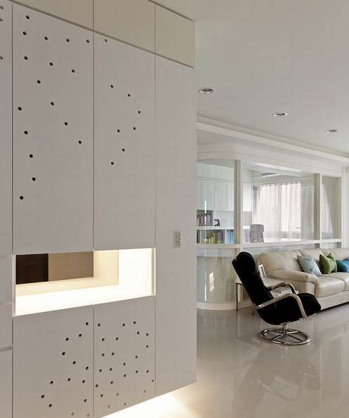 【太平洋家居网 设计频道】入门玄关采悬吊式鞋柜在下方打光营造出轻盈感,柜体顺应短墙加深为60公分,并使用抽盘让收纳拿取更方便实用,门片以不规则的洞孔造型妆点,同时兼具透气功能;屋主东西重收纳,顺应短墙做了一整排的收纳柜,除了鞋柜、衣帽柜外,靠近厨房的则是电器柜,以上掀式、拉盘和抽屉增加使用便利性,圆弧造型也兼顾了家中幼儿的安全性。