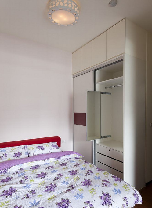 【太平洋家居网 设计频道】在玄关部分,玄关以夹纱玻璃化解穿堂煞的风水忌讳,同时保留透光的优势。幸运草造型的鞋柜门片,是造型也是透气孔更是把手,兼具多功能的用途,使用起来更加顺手;衣帽柜的造型与鞋柜相互呼应,两面柜另一侧作为电器柜使用,刻意以不同色调将置顶区块区隔,不至有压迫感。