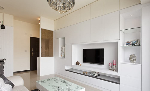 主要建材:夹纱玻璃、系统柜、木作、壁纸