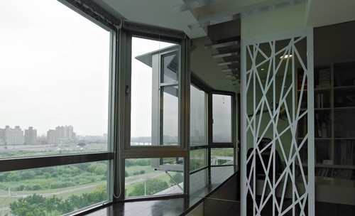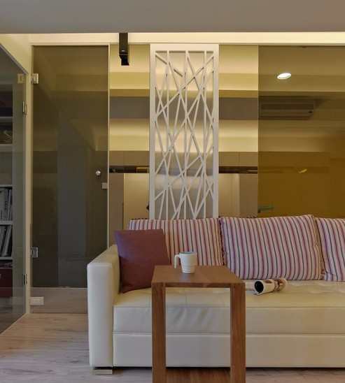【太平洋家居网 设计频道】老屋的采光不足,设计师以一份阳光通透破除,进入玄关成形的景观区,以格栅加入银色塑胶贴纸,点出天花轻盈的亮度,视线底端几何屏风巧妙虚化工作间的一览无疑,也让居家工作与小朋友的活动看顾有了基础互动,而对称性手法则将来客视觉自然导入,导引出公领域行进动线。