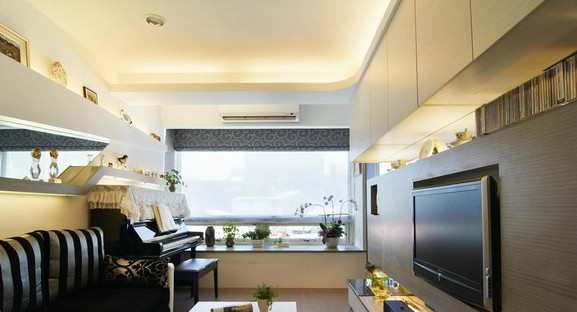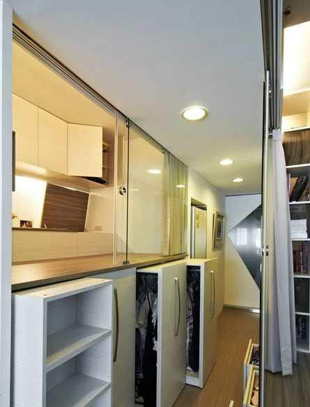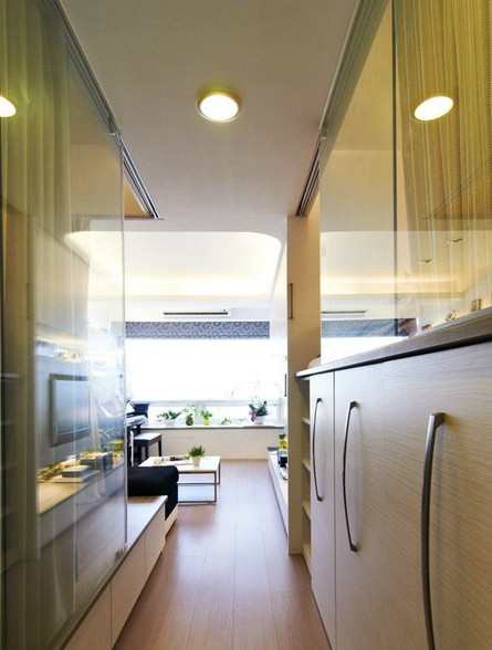 黄俊勋设计师更将厨房及卫浴安排在门片后方,将冰箱和全身镜隐藏在走道里,不只是照顾到三位家庭成员的日常作息。