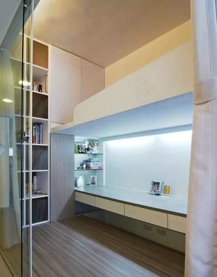 下方规划为收纳及书桌用途,上铺则为睡眠区,两间房间上方互通的空间亦可放置大型物品。