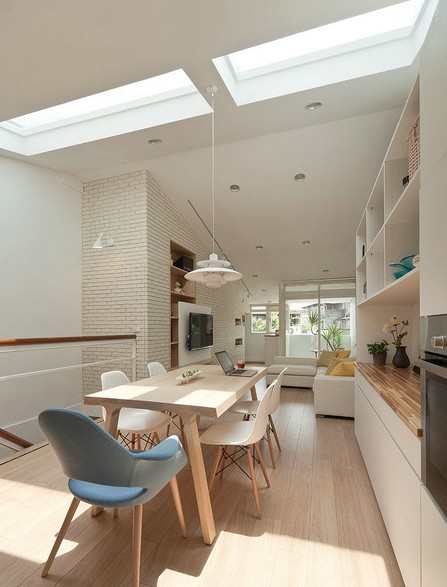 拥有楼顶得天独厚的优势,将旧有的屋顶再架天花板,并开立两面天窗引光入室,改善光线不足的问题,也打掉不利光线穿透的隔间,使整体空间变得更加明亮,让日光融入生活当中,成为重要的角色。