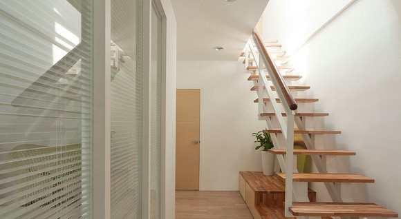 也顺利将光引进楼下空间,使整体徜徉于日光浴之中,加上纯白与木纹搭配的家具,彷佛传达着大自然生态环境与人和谐共存的关系。