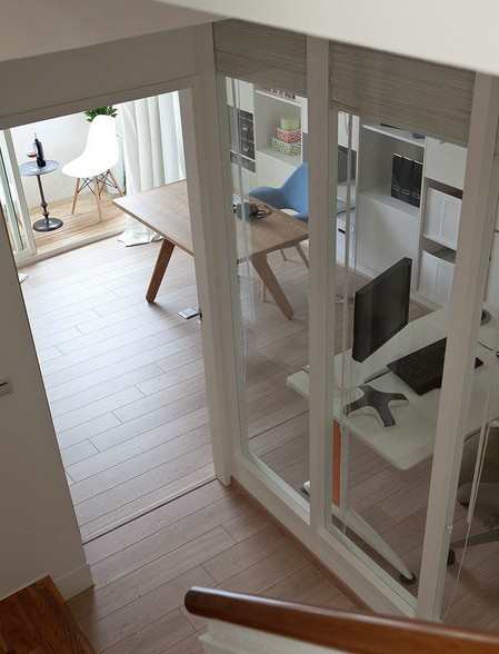 随着集成浮木香杉所搭制的楼梯来到下方的私人领域,独立书房与个人工作室为理想中的办公区,大面落地玻璃做简单的空间区隔。