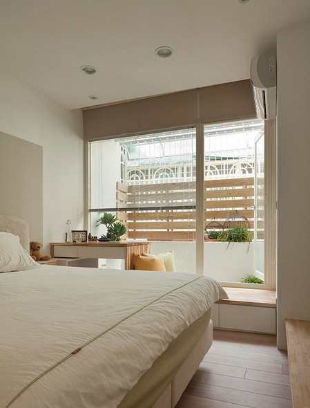 卧室也特别打造一座小阳台花园,运用透明玻璃窗改善室内光线不足的问题,隔栅与卷帘则可以保有个人隐私,却不失整体和谐。玉马门设计堪称为室内设计的光影魔术师,无论于美感提升或个人隐私皆面面俱到,打造独一无二的日光家居。