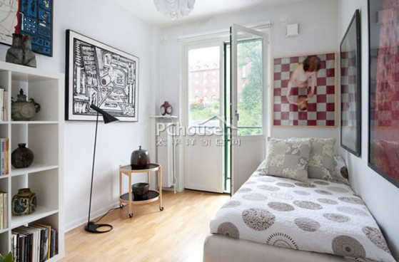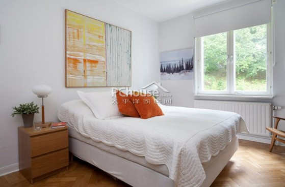 白色的墙壁上挂着颜色鲜艳的油画,色彩明亮的枕头倒成了卧室的风景线。木质的地板更显温暖。