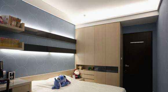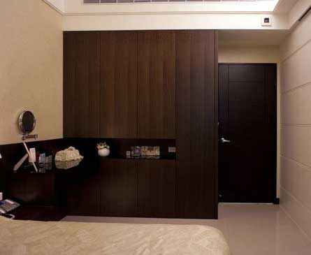因此,设计师仔细斟酌如何呈现较宽敞的空间感,于卧室主墙以水平延伸入柜体的线条,将视觉往两端延展开来,并搭配壁灯、间接灯光,移转视觉焦点,营造出无压迫感的舒适卧眠区。