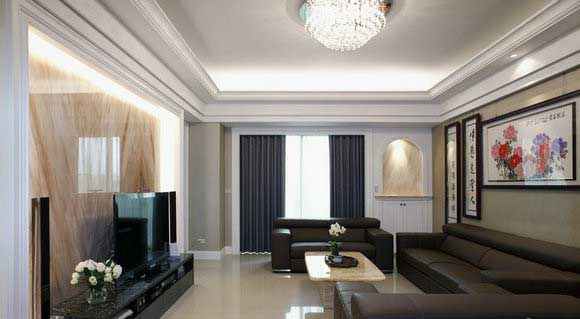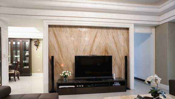 步入客厅,奥罗拉大理石呼应桌面黄水晶,寄予招财之意,沙发背墙以牡丹花挂画,代表着花开富贵的荣华景象,欧风大线板与窗拱造型,营造出简单大方的空间质感。