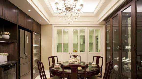 转入餐厅,于文昌位设计大面积的图书储藏柜,让廊道空间盈满书香气息,与深色的中国风餐厅形成有趣交流。
