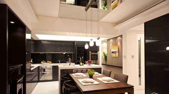 再将厨房打通形变为开放式餐厨空间,全面打开公共空间的封闭格局,让流动的光体串连每一个独立场域。