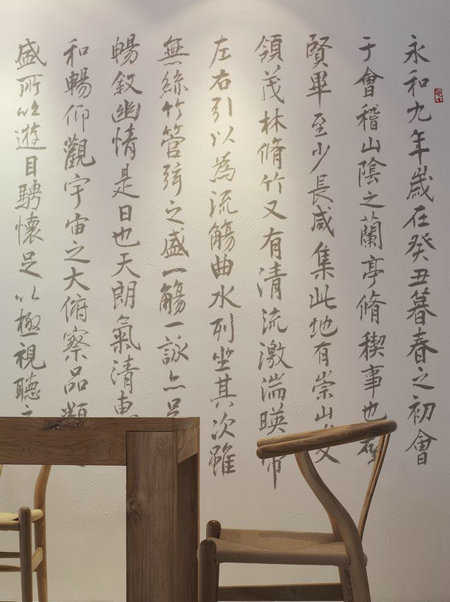 原本屋主期待能复制原版兰亭集序输出在留白墙面上,但许炜杰设计师认为王羲之醉酒书写时有修改涂抹的痕迹,且难以在墙面上表现出狂放流畅的真迹韵味。