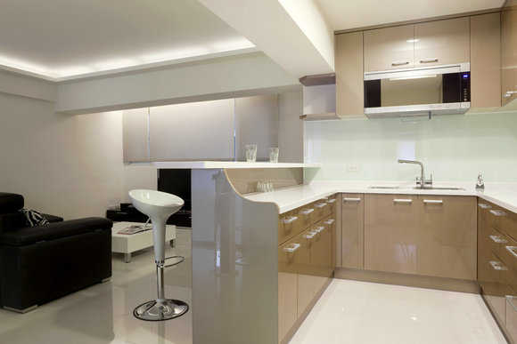 厨房采开放式设计,设计师还特别为女主人良身打造收纳功能早餐吧台,“能与坐在吧台上吃着早餐的女儿聊着女生心事,光是想象那画面就觉得很美。”有别于客厅与餐厅深色系家具的沉稳内敛,卿敏华选用浅色系厨具平衡开放空间里的整体美感,镜面反射材质与地板相互辉映,折射出更宽广视觉感受。