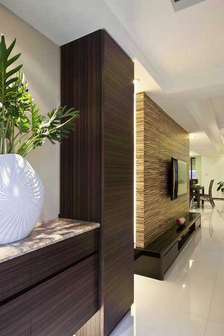 由庭院开始,依据回家的整个过程往内规划,增加玄关空间作为进入客厅的缓冲,以木纹的自然肌理为居家变换不同的表情,玄关大器的沉稳端景,以木皮包覆衣帽间,用相同的语汇与室内连结。