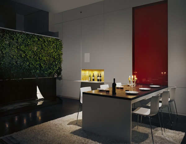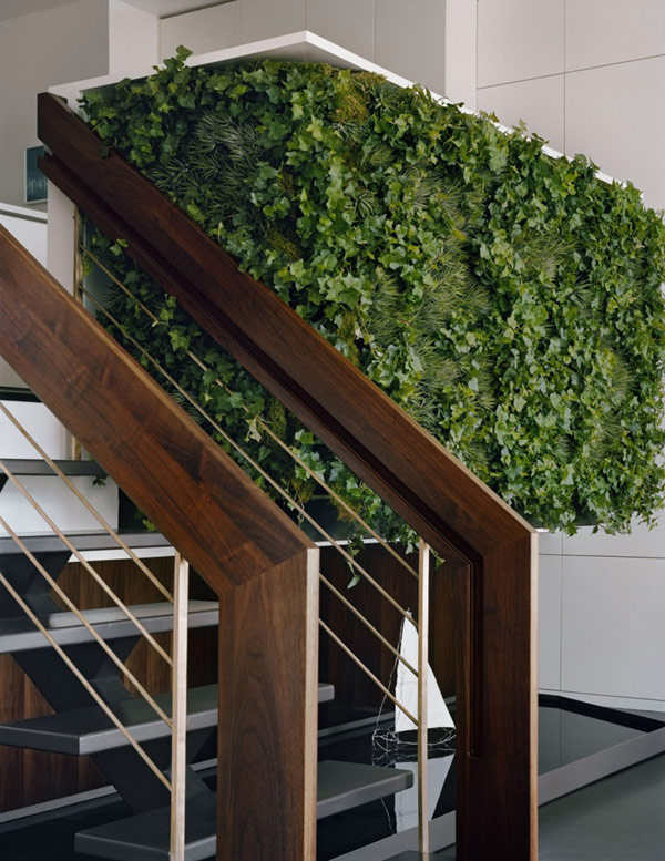 全屋的亮点在于这一块布满绿色植物的墙壁,为远离郊区的都市人提供了亲近大自然的宝贵机会。