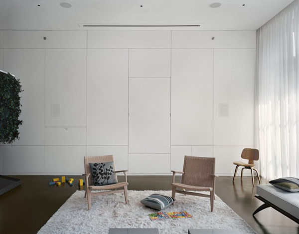 从这个角度看,客厅的墙壁有明显的间隔条纹,原来是隐藏起来的可以放下的桌子。下面的图片将为你展示这个设计精妙之处。
