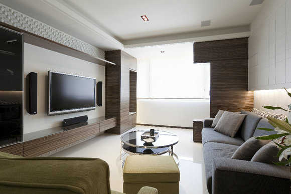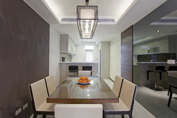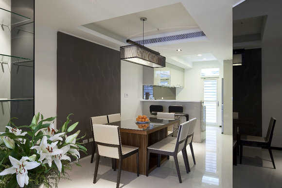 客厅、餐厅、厨房定位于同一轴线,让前后采光连贯,甫入室内,即可将公共空间的全景纳入眼底,客厅以白与黑檀木各据一方,产生视觉对比与交流,沙发墙细腻切割线条装饰,年轻玩味的设计,增添空间的趣味性。