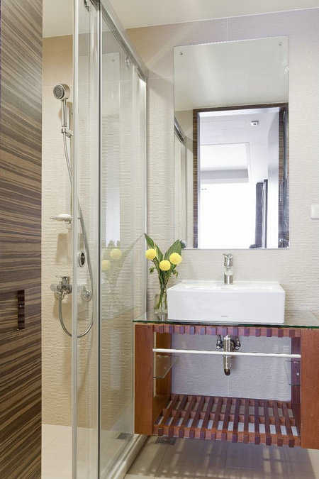 主要建材:黑檀木、人造石、抛光石英砖、壁纸