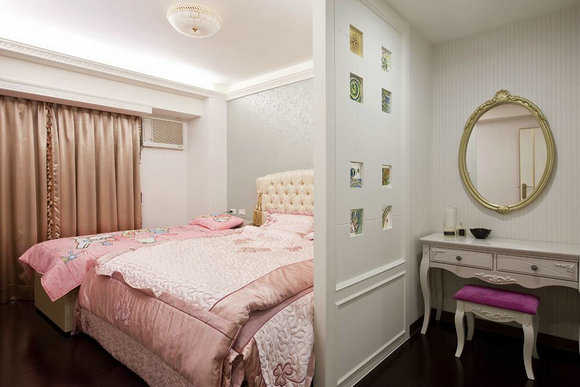 分属两段落的私领域,在主卧房隔屏以窑烧玻璃的波光潋滟,区隔出卫浴及梳妆区块,回避了风水忌讳;而粉色系的公主风,色彩变化下利用原格局中弧形畸零,添以罗马柱的梦幻,开创出小女孩的阅读区块。