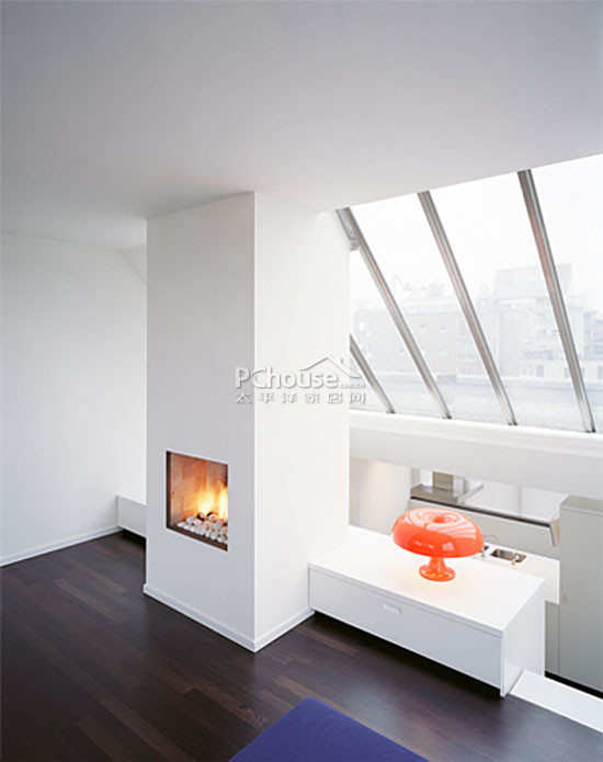 倾斜的墙面采用了透明的玻璃和不锈钢的支架,增加了房子的通透感,主人坐在沙发上,一抬头便能轻易地看到窗外城市的美景。柱子里的小壁炉搭配着旁边的橘红色台灯更是增加了房子的温暖感觉。