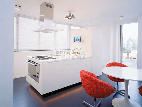 橘黄色带着花纹图案的桌椅为单调的白色增添了生机,是厨房和餐桌区的点睛之笔。素洁的柜橱及不锈钢的电器让人很有烹调的冲动。黑色的地板梯和白色的墙壁以及厨房家具之间创造了强烈的对比。