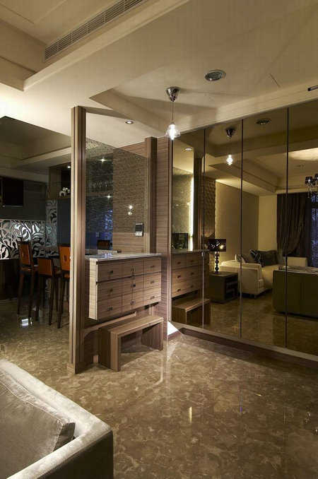 整体以低调奢华风格主导,玄关区域运用茶镜,做为延续空间感的因子。隔屏设置以夹纱玻璃与吧台区域做界定,设置穿鞋椅,方便业主生活机能的使用。于角落增设的45度的转角柜成为空间端景之一。