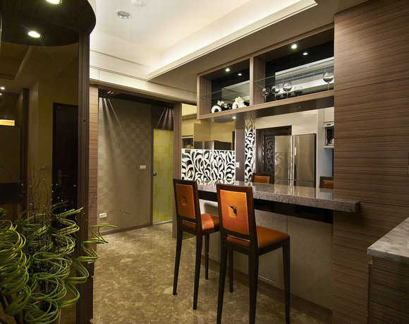 吧台兼具餐厅的区域机能,透过开放方式的厨房设立,让空间机能关系更为完整。吧台区域与私密空间设计电动门扉作界定,以茶镜、镂空图腾做规划,明确的区分公共及私密区域的位置。