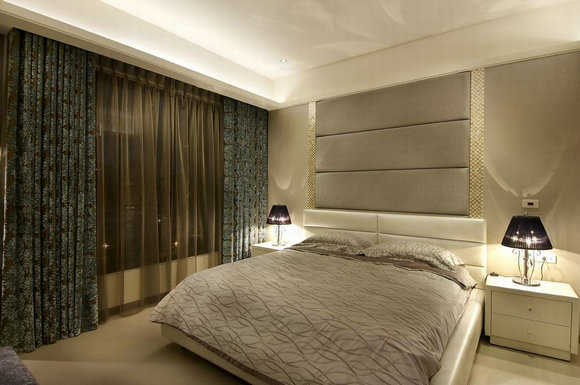 主卧主墙面以裱布、配搭贝壳质材框塑出空间细致高雅的氛围,利用畸零空间形塑出展示及收纳区域。