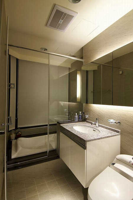 浴缸以降板式的设计、干湿分离的规划,加大的明镜设计、黑、白调性的材质及配件,积极的形塑空间的阔绰质感。